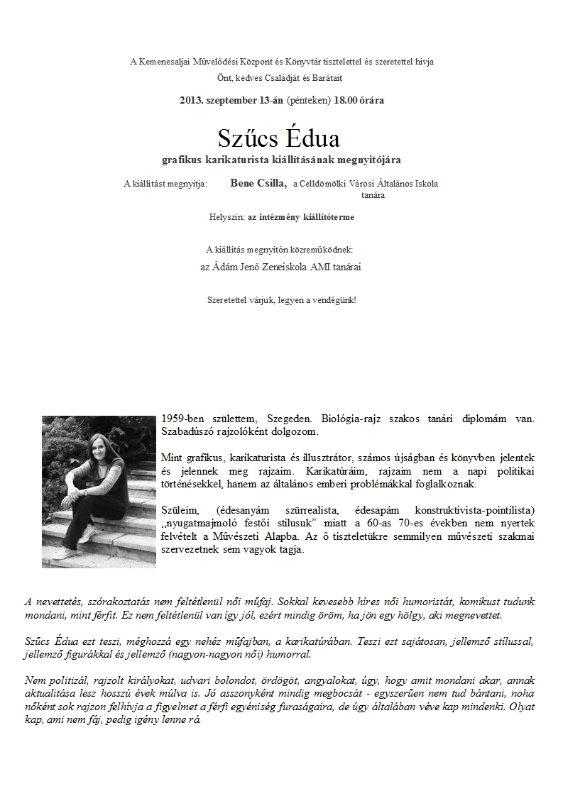 Szeptember 13. péntek 15.00 óra Szűcs Édua grafikus karikaturista kiállításának megnyitója Helyszín: Intézmény kiállítóterme