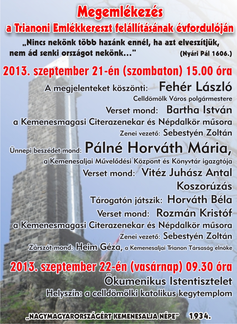 Szeptember 21. szombat 15.00 óra Trianoni Emlékkereszt felállításának évfordulója tiszteletére szervezett városi megemlékezés. Helyszín: Ság hegy Trianoni emlékmű