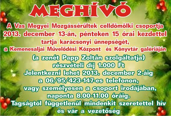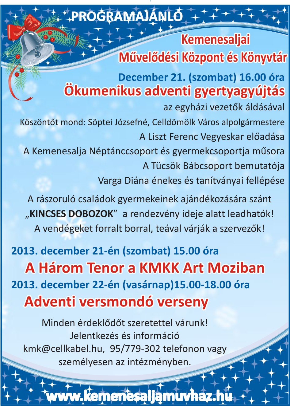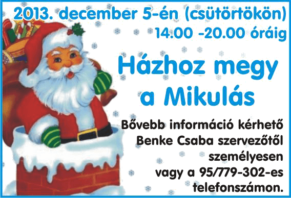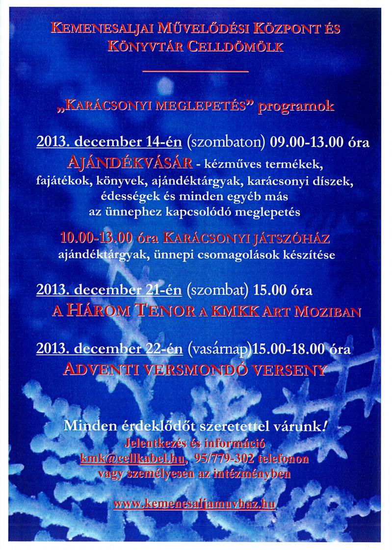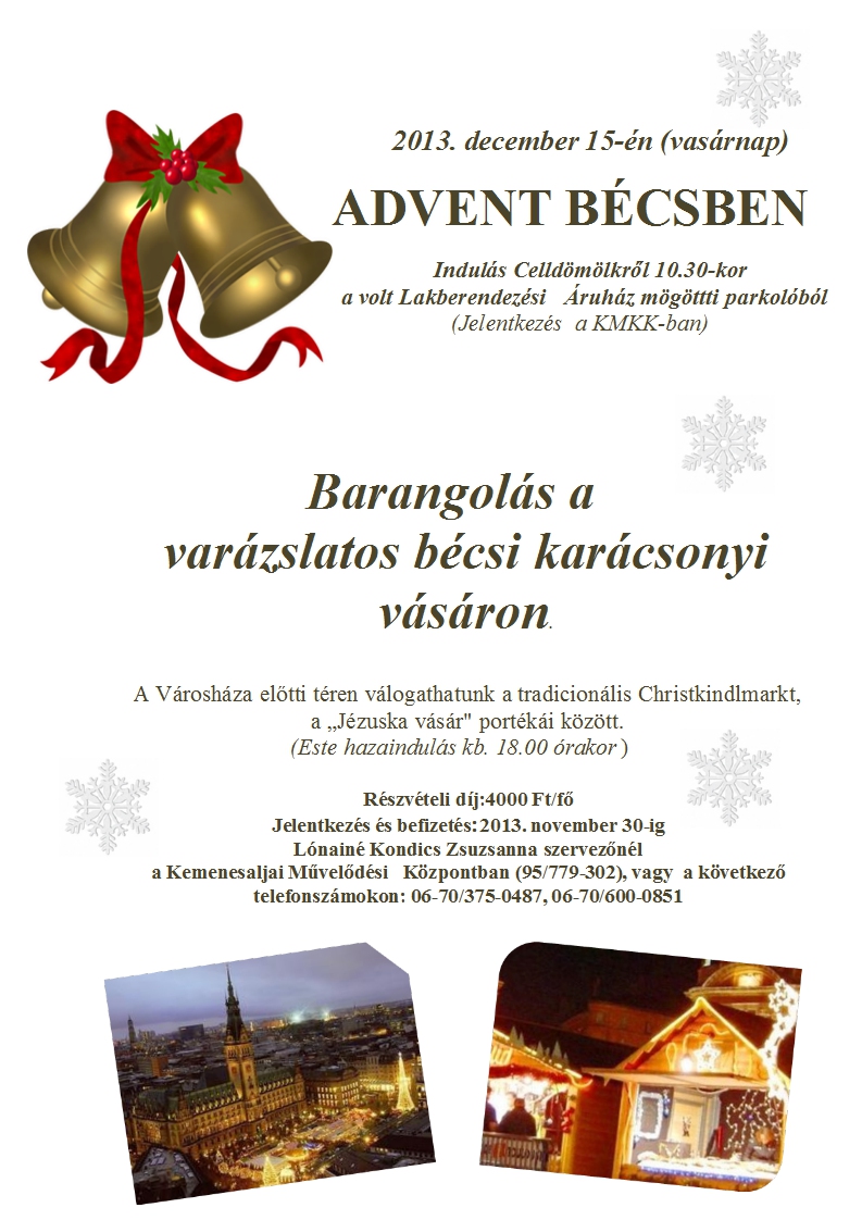 Decemberi programok December 5. (csütörtök) Házhoz megy a mikulás 14.00-20.00 óráig December 13. (péntek) Meghívó December 15. (vasárnap) Advent Bécsben "Karácsonyi meglepetés" programok December 21-22. Programajánló December 28. Programajánló Megosztás